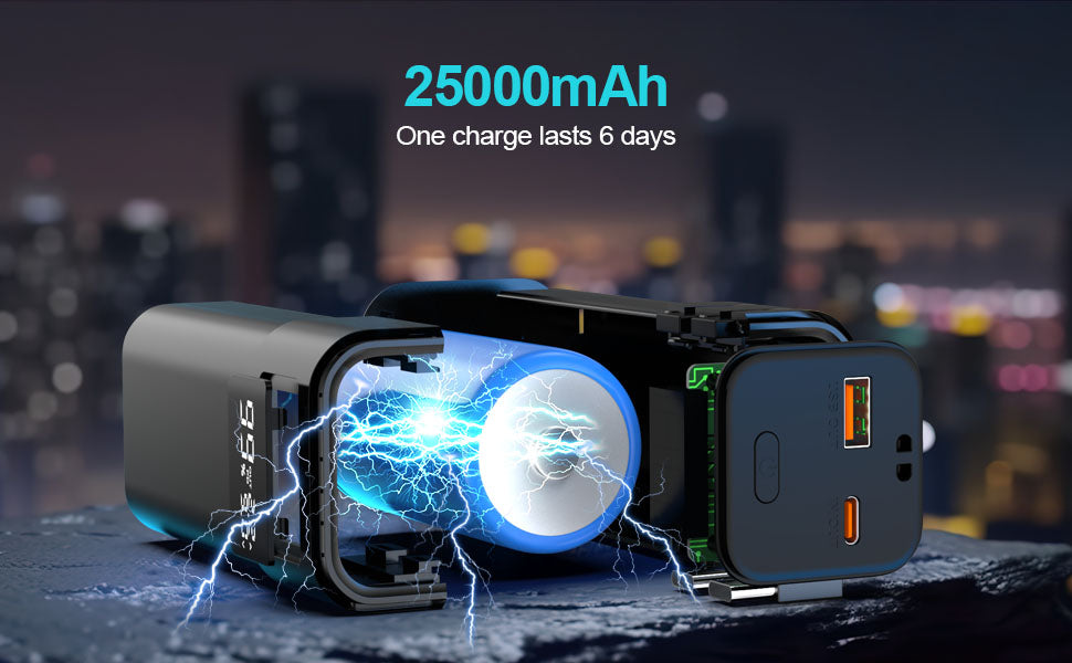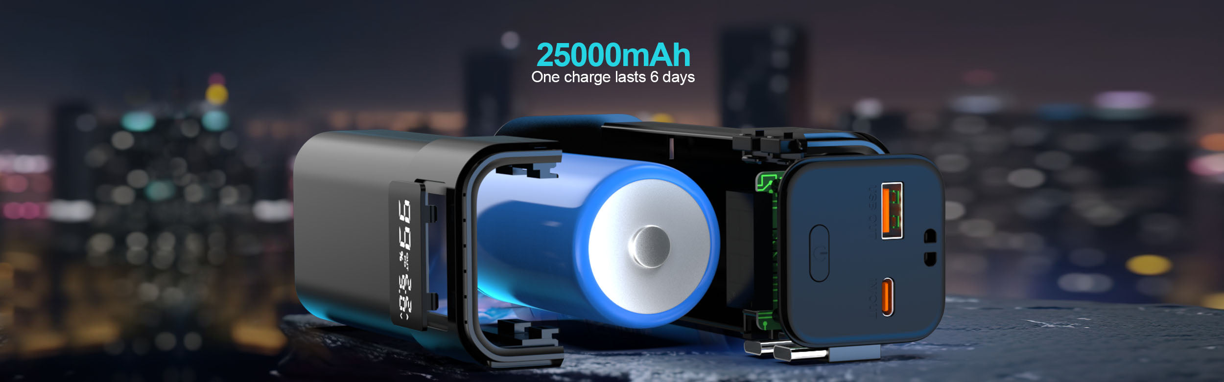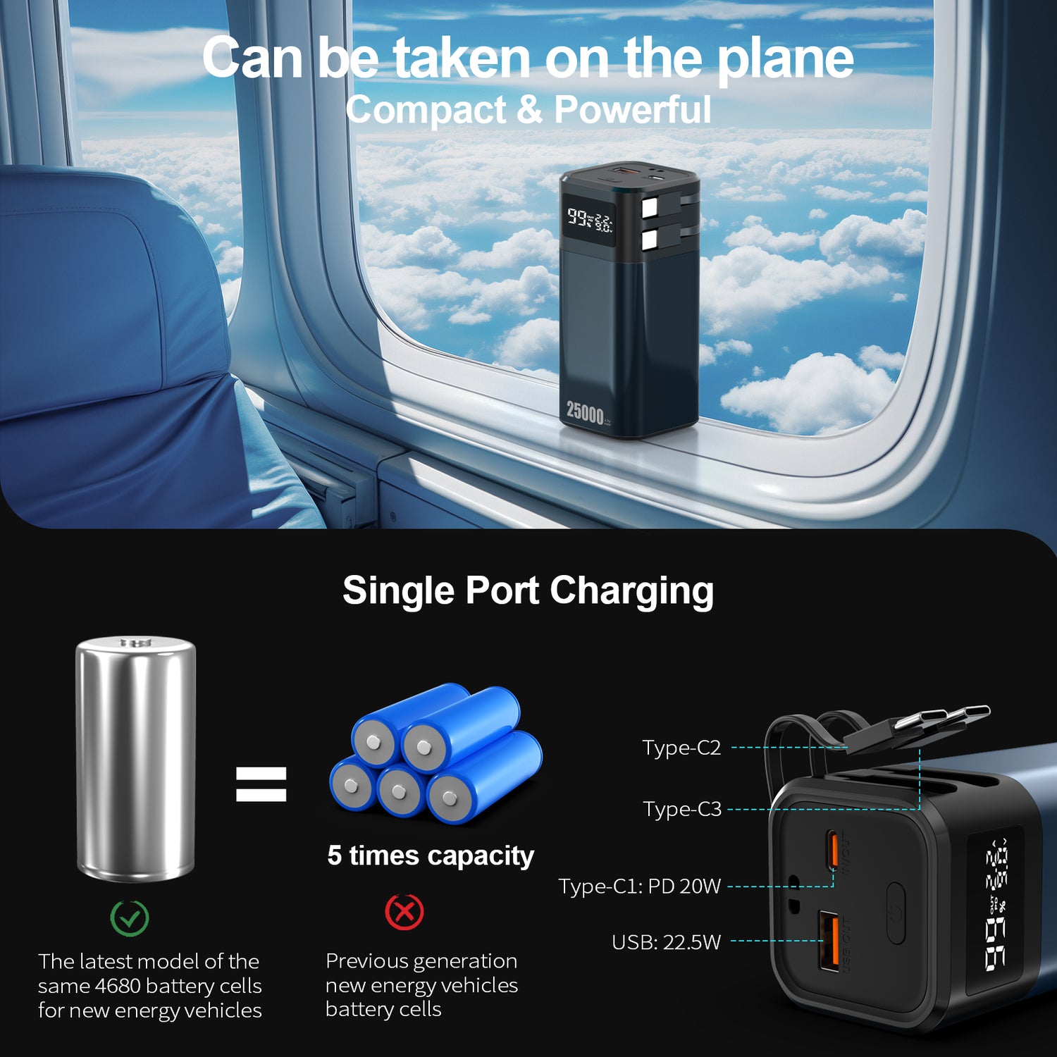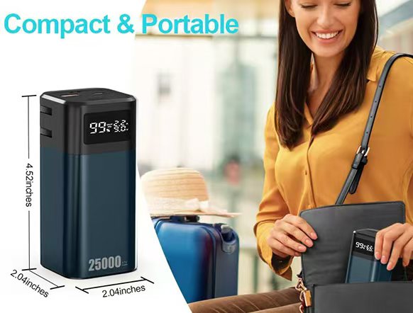 Answer: This power bank is equipped with a 25000mAh battery capacity, which is sufficient to charge most smartphones 5-6 times (the actual number of charges may vary depending on your phone model). Additionally, it can efficiently charge tablets, laptops, and other devices, making it ideal for your travel needs.